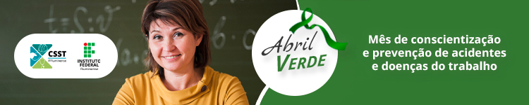 O mês de abril é dedicado à conscientização sobre a prevenção de acidentes do trabalho e doenças ocupacionais. Por isso, a Coordenação de Saúde e Segurança no Trabalho do IFF desenvolveu a campanha "Abril Verde - Construindo uma Cultura de Saúde e Segurança no Trabalho", com intuito de criar uma consciência a respeito de como dever ser um ambiente de trabalho saudável e fazer com que os servidores ampliem seus conhecimentos sobre o tema e contribuam para promoção de um espaço laboral cada vez mais seguro, saudável e com preservação da vida no Instituto Federal Fluminense.