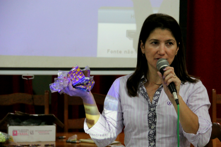 Elaine distribuiu brindes ao fim da aula, reforçando a importância do uso de preservativo.