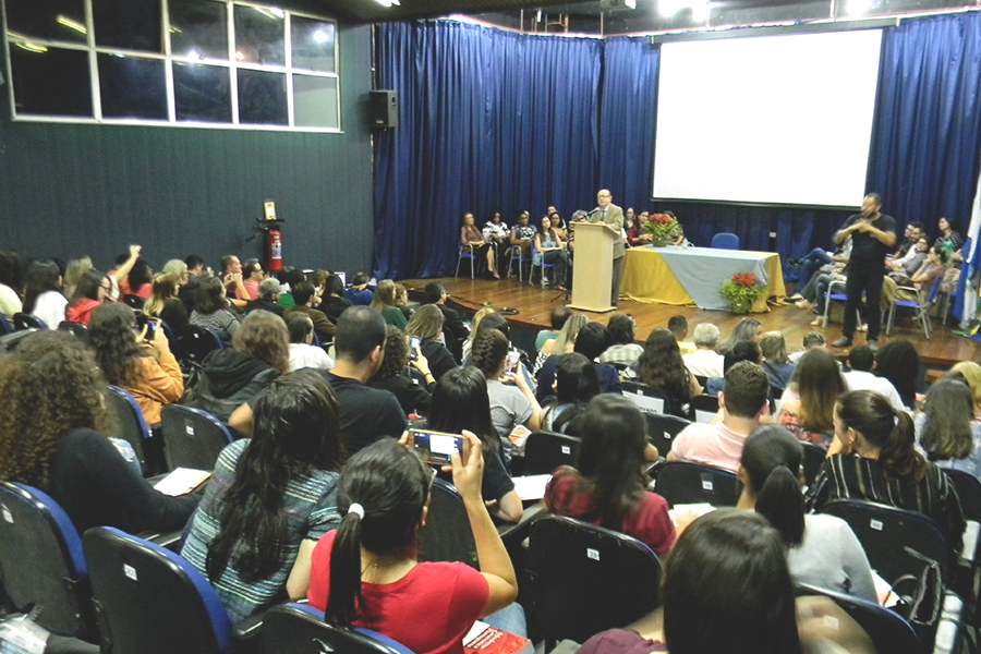 O professor Evanildo Bechara em conferência no Campus Campos Centro do IFF (Rakenny Braga/Comunicação Social)