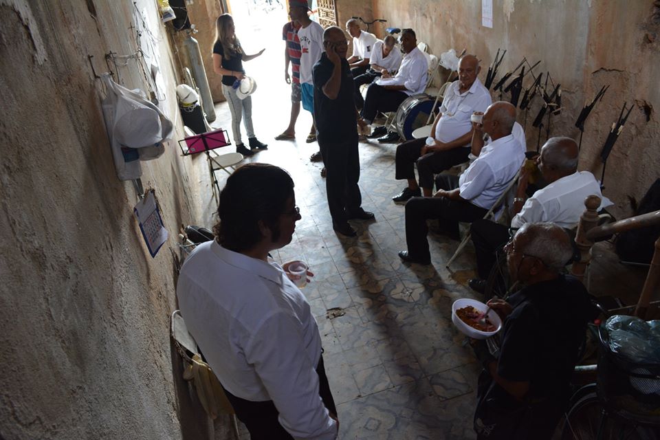 Os músicos no hall de entrada do prédio, onde os ensaios acontecem (Divulgação).