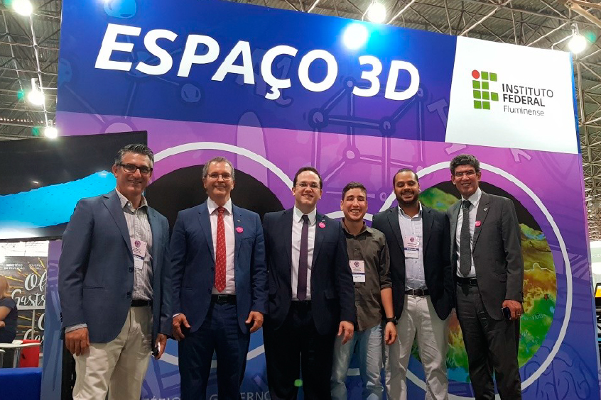representando o Ministro da Educação, Rossieli Soares), Carlos Henrique Coutinho e Lucas Moreira Dias (alunos de Engenharia IFF - Macaé) e Wilson Conciane (reitor do IFB), no estande de apresentação do Projeto Dispositivo Reconfigurável para Visualização 3D de Superfícies