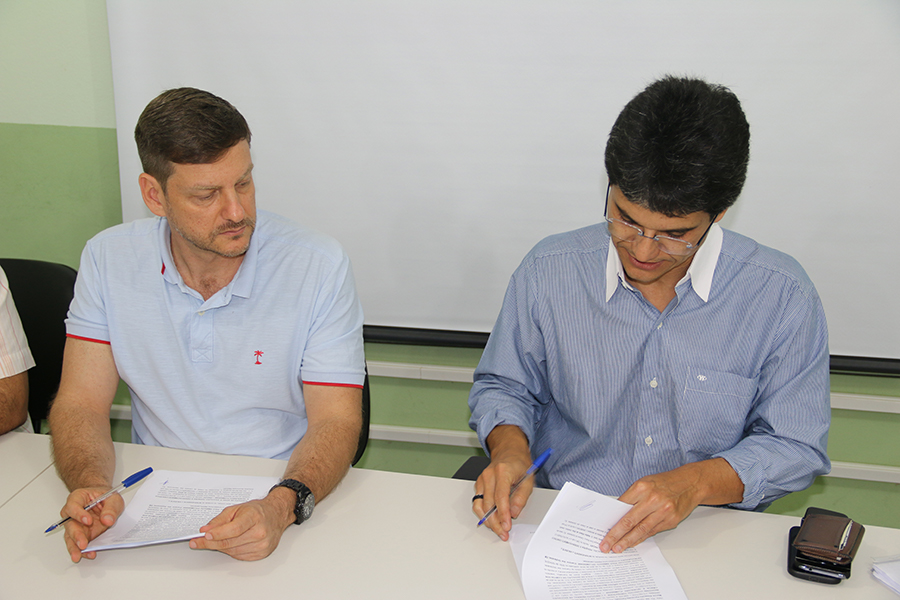 Reitor Jefferson Manhães e o diretor do Polo, Rogério Atem, durante assinatura do contrato